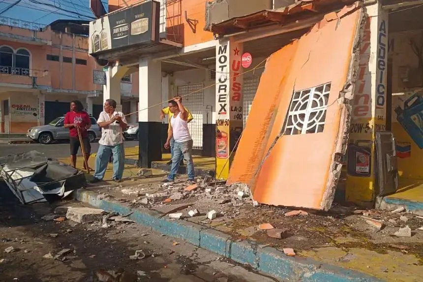 - La gente permanece afuera de una tienda dañada después del terremoto que azotó la ciudad de Esmeraldas, Ecuador, el 25 de abril de 2025.